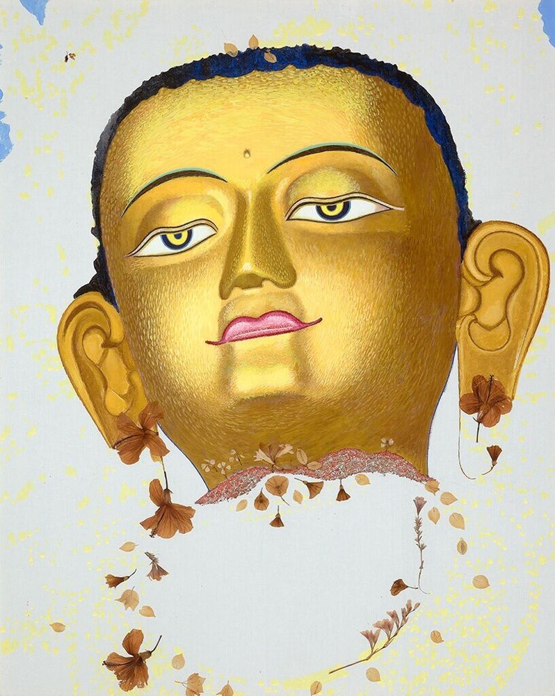 egg tempera, glitter, flowers and petals on canvas on triplex panel behind glass in gilt wooden frame